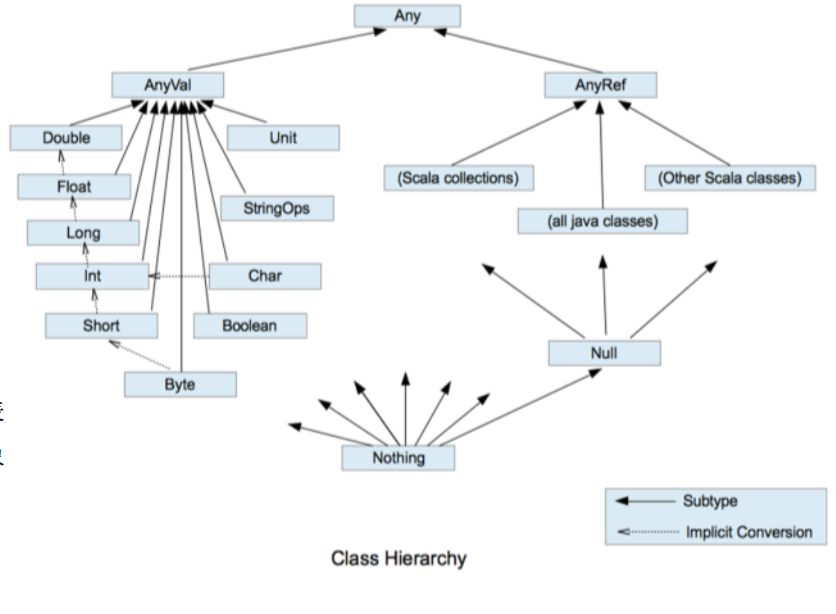 - Scala中的数据类型:数值类型(AnyVal)、引用类型(AnyRef),但是不管是数值类型还是引用类型都是对象