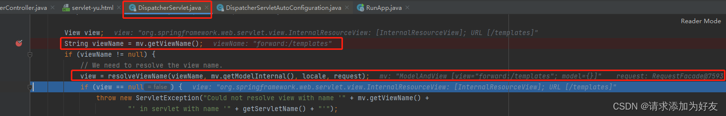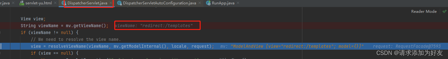 可以看见我访问 /templates路径会显示 servlet-yu.html页面,我在访问 /interView路径的时候方法返回的是一个路径,经过转发的方式重新按照新的路径找寻视图进行加载返回给浏览器显示。