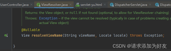 <!--path :设置处理的请求地址view-name :设置请求地址所对应的视图名称--><mvc:view-controller path = "/templates " view-name = "servlet-yu " ></mvc:view-controller><!--我一旦设置这个控制器,就可以不用再后端写 /templates这个路径对应的方法,也可以直接访问servlet-yu页面在什么情况下使用,在请求映射方法中没有其他请求映射处理,只需要一个视图名称时,就可以使用,当 SpringMVC 中设置任何一个 view-controller 时,其他控制器中的请求映射将全部失效,此时需要在SpringMVC 的核心配置文件中设置开启 mvc 注解驱动的标签:<mvc:annotation-driven />-->