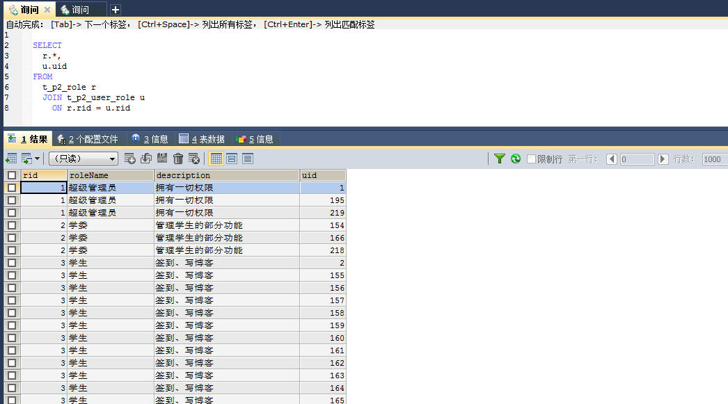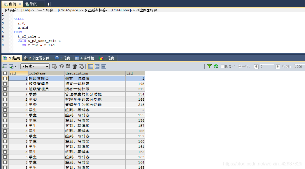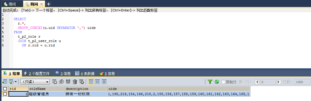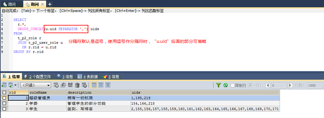 例如:在权限设计中,一个角色ID(rid)会对应多个用户ID(uid),按照一般的SQL语句是这样的
