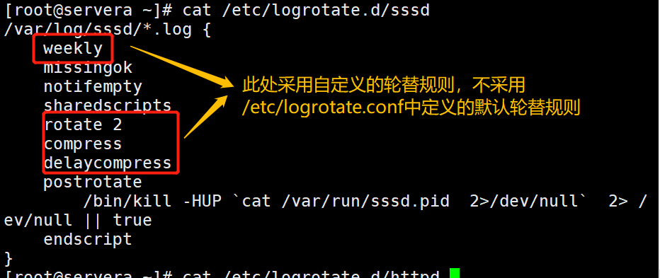 注意:如果针对某个具体的日志文件定义了轮替规则,那么这个日志文件的轮替规则就会采用自己定义的轮替方式。