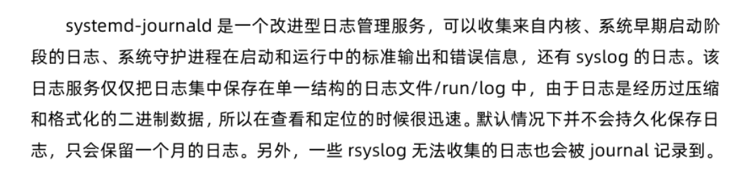 - systemd-journald.service: 记录与服务、开机引导有关的日志,服务在运行的时候才有相关的日志,它以二进制文件的形式保存在内存中,如果系统被重启或关机之后,systemd-journald.service保存的日志就没有了。