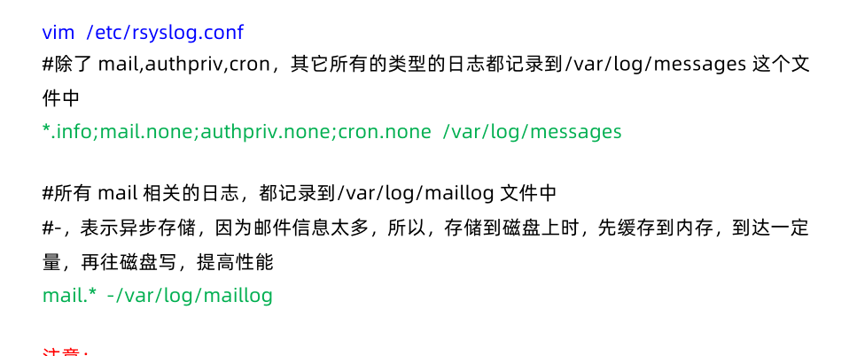Tips:从上到下,级别从高到低,记录的信息越来越多若定义了日志的等级是info,代表包含了info以及以上的所有等级事件日志都记录。如果是*.none,则不记录该服务的任何日志。