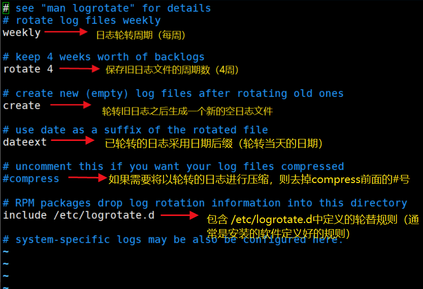 相关配置文件:/etc/logrotate.conf(默认规则)
