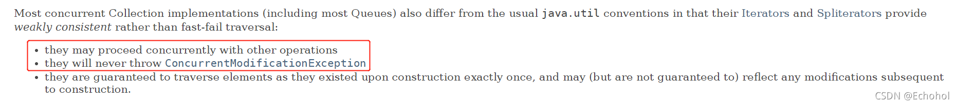 大多数的并发包容器类的遍历(包括大多数的队列)和寻常的util包中的不一样,它们使用Iterators和SplitIterators中的方法,提供了弱一致型(weakly consistent)的而不是fail-fast型的遍历