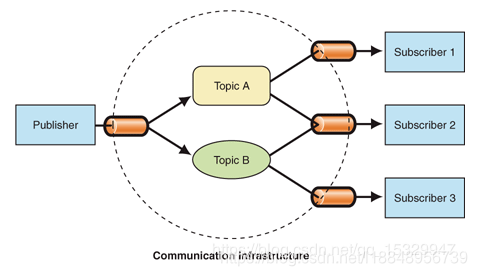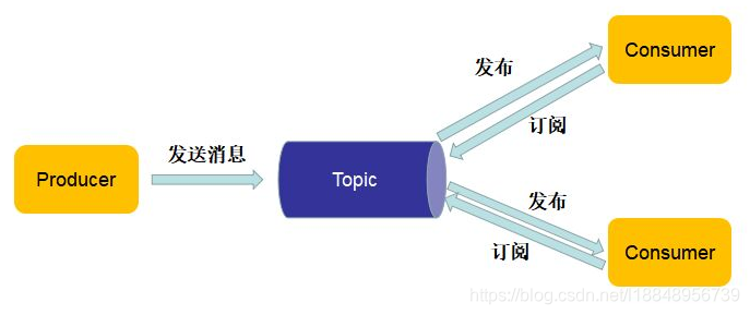 发布订阅模式定义了如何向一个内容节点发送和订阅消息,消息发送者将消息发送到某一主题(Topic)上,消息订阅者从主题中订阅消息。发布/订阅在一对多广播时使用。模型如图所示: