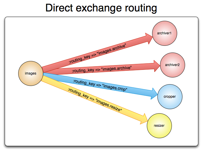 direct exchange 根据消息携带的 routing key 将消息投递到不同的 queue中,direct exchange 适用于消息的单播发送。工作流程如下: