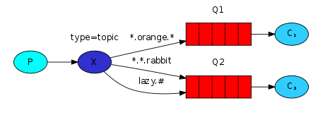 topic exchange 会根据 route key 将消息分发到与此消息的 route key 相匹配的并且绑定此exchange的一个或多个 queue。这里的“相匹配”与 direct exchange的完全匹配的路由规则不一样,topic exchange 在匹配规则上进行了扩展,规则如下: