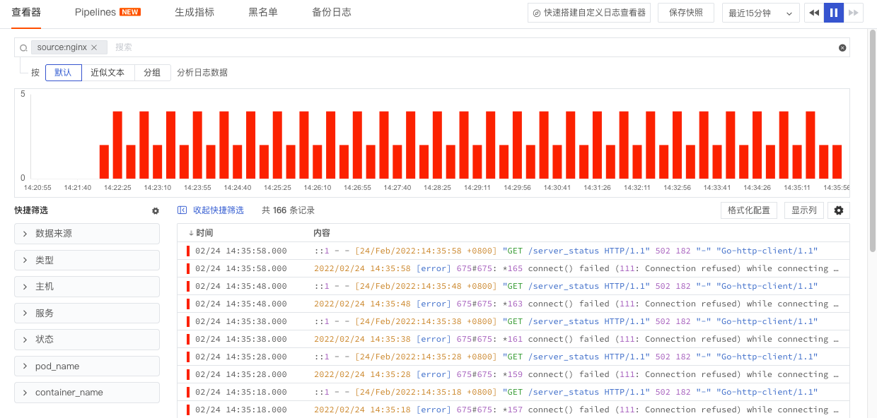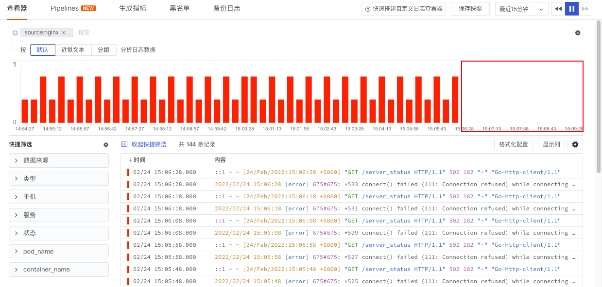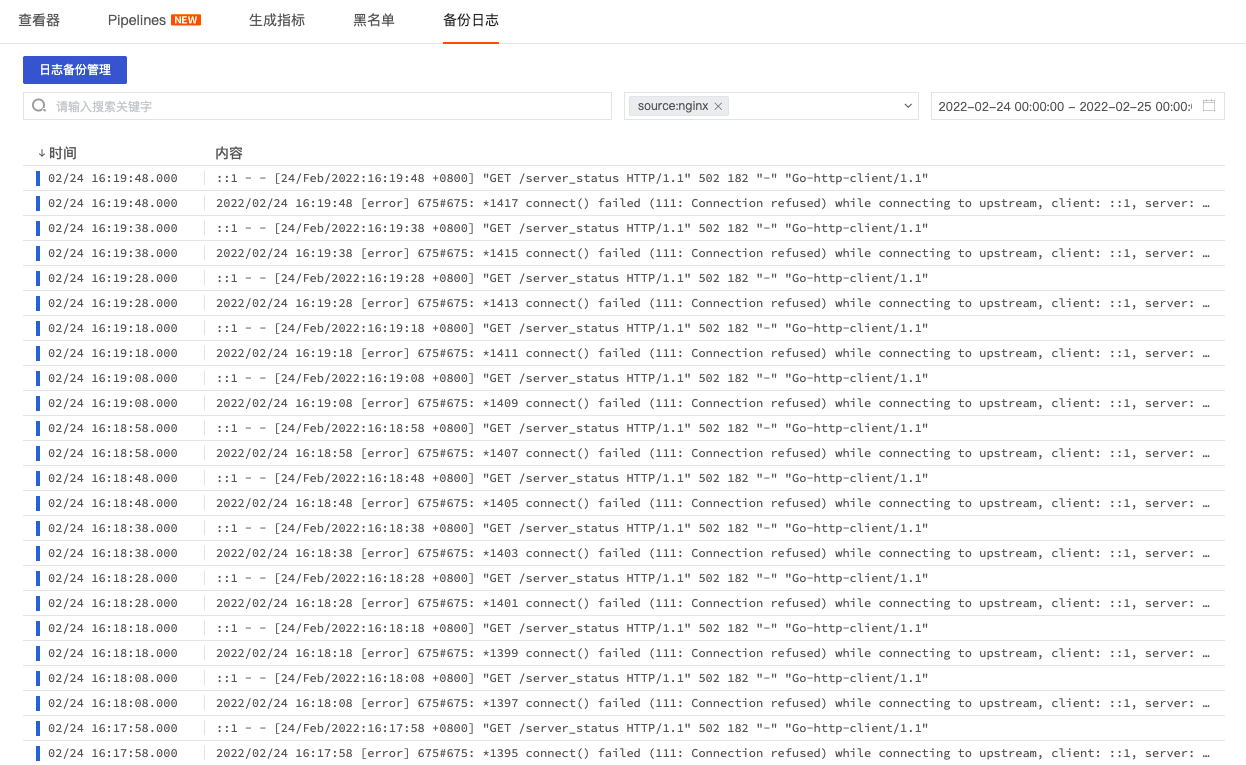 在日志黑名单设置了过滤掉所有日志来源为“nginx”的日志,在设置生效后,我们可以看到“02/24 15:06:28”之后,nginx日志不再上报到工作空间。更多详情参考文档 日志黑名单 。