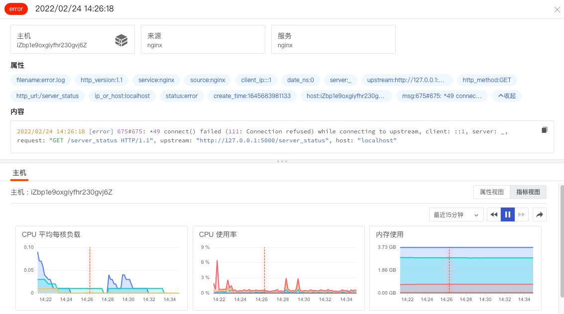 在观测云工作空间的日志下,选择 nginx 的日志,在日志详情页,我们可以看到产生日志的主机及其属性指标视图、日志来源、通过pipeline切割的日志属性、日志内容详情等数据,通过配置链路关联日志,我们还可以在日志详情页查看相关的链路详情,帮助您快速做数据关联分析。