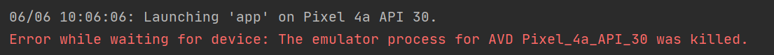 Error while waiting for device: The emulator process for AVD Pixel_4a_API_30 was killed.