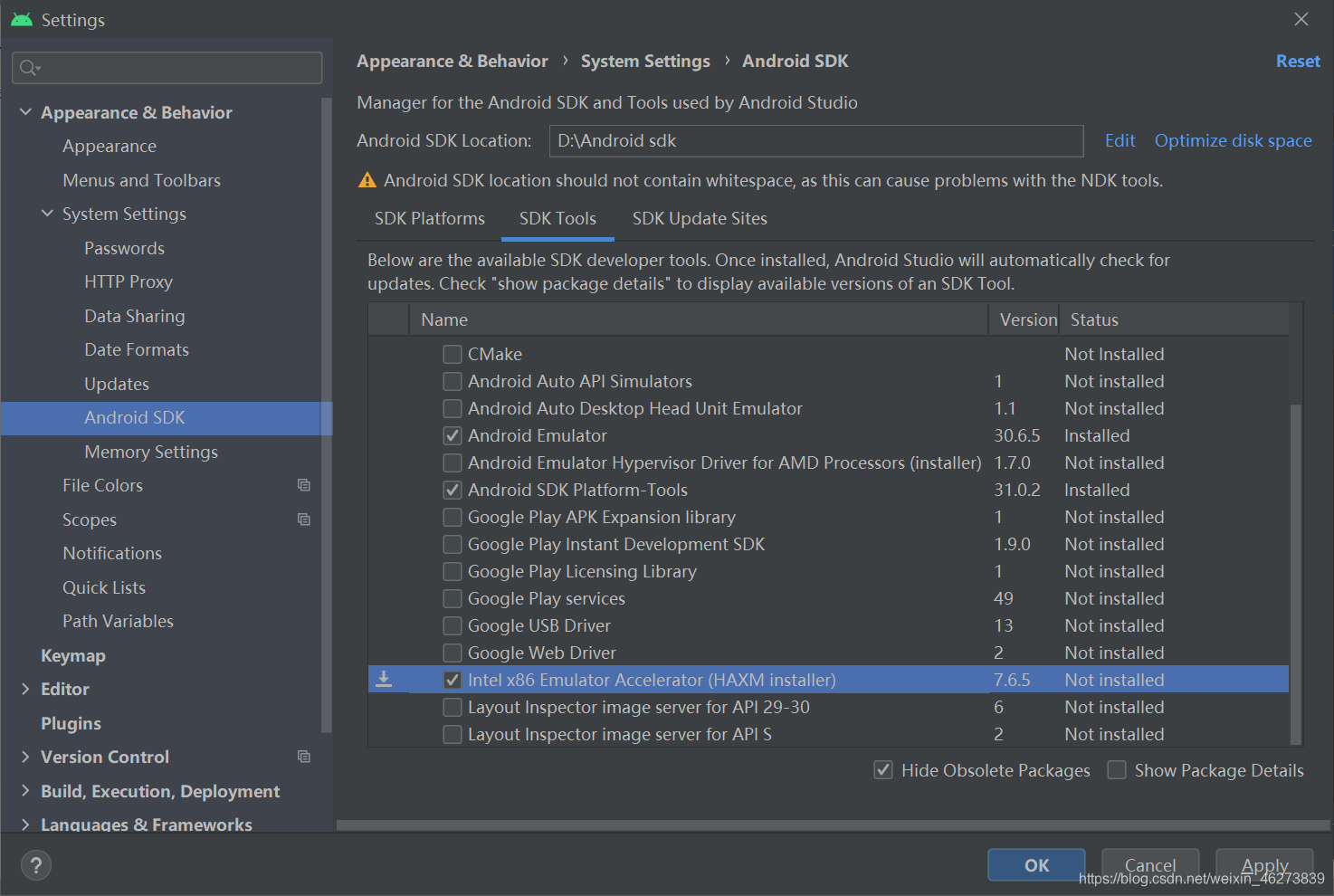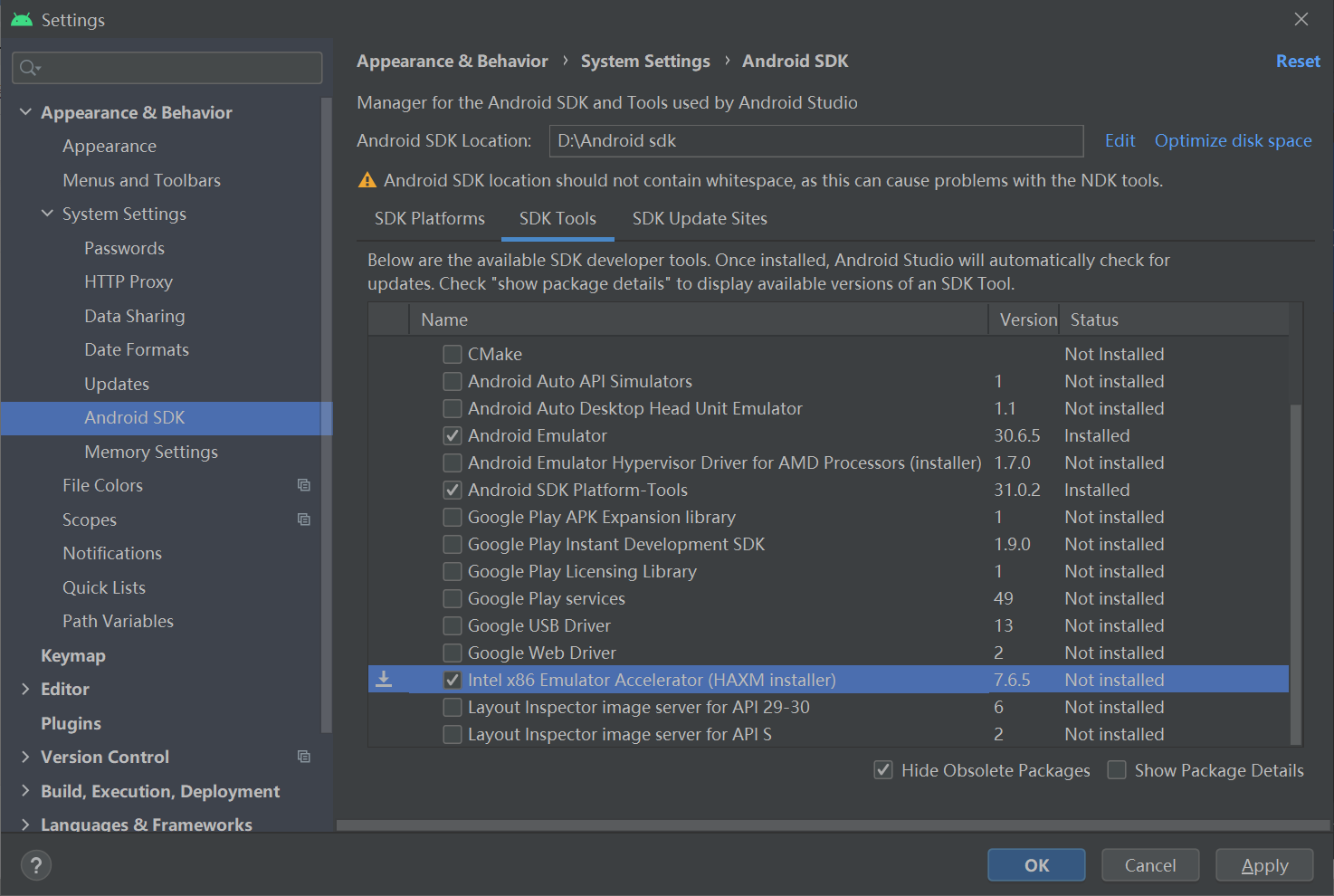 查看HAXM是否已经下载:Settings->Appearace&Behavior->System Settings->Android SDK->SDK Tools