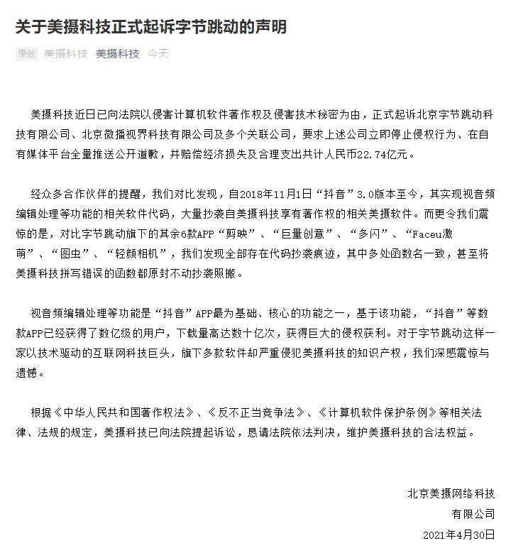 美摄科技表示近日已向法院以侵害计算机软件著作权及侵害技术秘密为由,正式起诉北京字节跳动科技有限公司、北京微播视界科技有限公司及多个关联公司,要求上诉公司立即停止侵权行为,在自有媒体平台全量推送公开道歉、并赔偿经济损失及合理支出共计人民币 22.74 亿元。