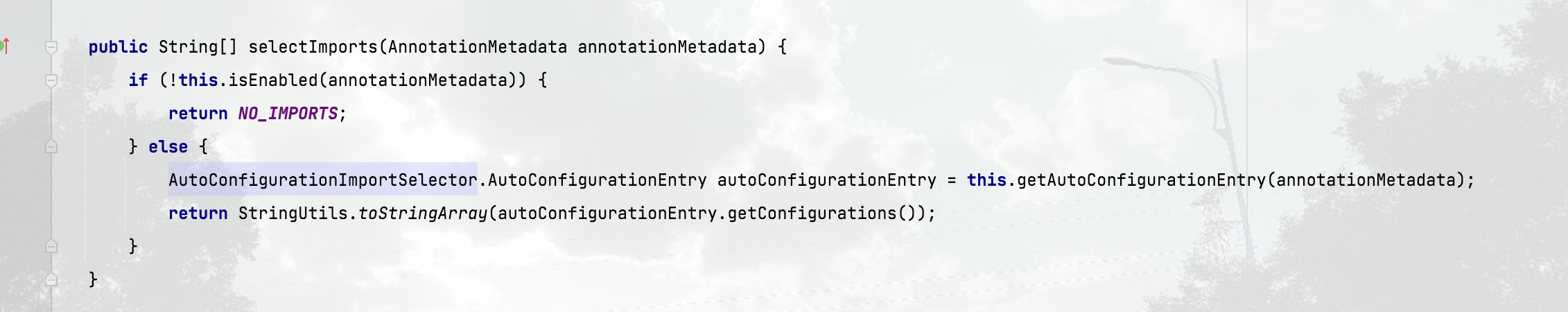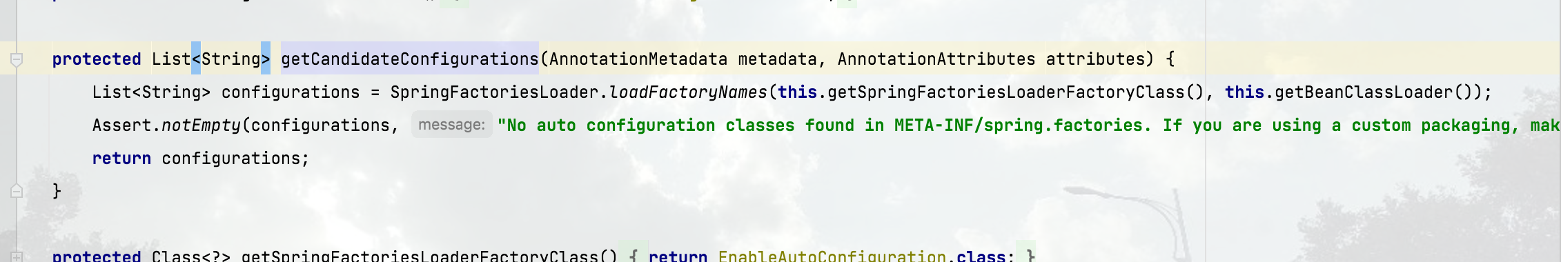 @EnableAutoConfiguration借助AutoConfigurationImportSelector的帮助,而后者通过实现selectImports()方法来导出 ConfigurationAutoConfigurationImportSelector类的selectImports()方法里面通过调用Spring Core 包里SpringFactoriesLoader类的loadFactoryNames()方法最终通过