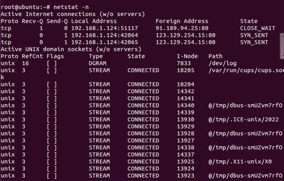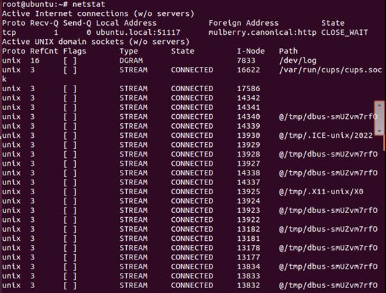 Proto显示连接使用的协议,RefCnt表示连接到本套接口上的进程号,Types显示套接口的类型,State显示套接口当前的状态,Path表示连接到套接口的其它进程使用的路径名。