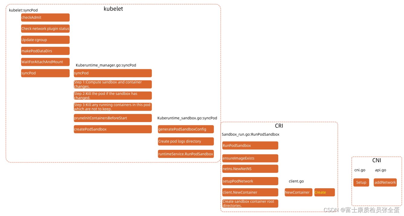 然后你要启动一个新的容器,那么会去经历启动的动作。之前讲了第一步就是createpodsandbox,它会去生成这些sandbox的config,它有一些mainfest,要将这些配置文件生成出来。然后pod的日志目录要创建好,然后要去调用runtime的sandbox。