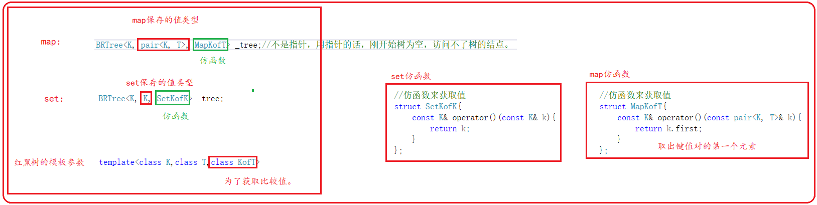 解决方法是:在map里定义一个类,写一个仿函数来得到键值对key的值。在set里定义一个类,写一个仿函数来得到set保存的值。将类名作为模板参数传给红黑树,要使用比较时,只需要用该模板参数实例化一个对象,作用域要取出值的结点,就能取出set或者map对应的值了。