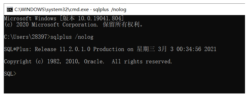 启动SQL*Plus,并连接到数据库(使用默认的用户名和密码进行连接)。如下图所示