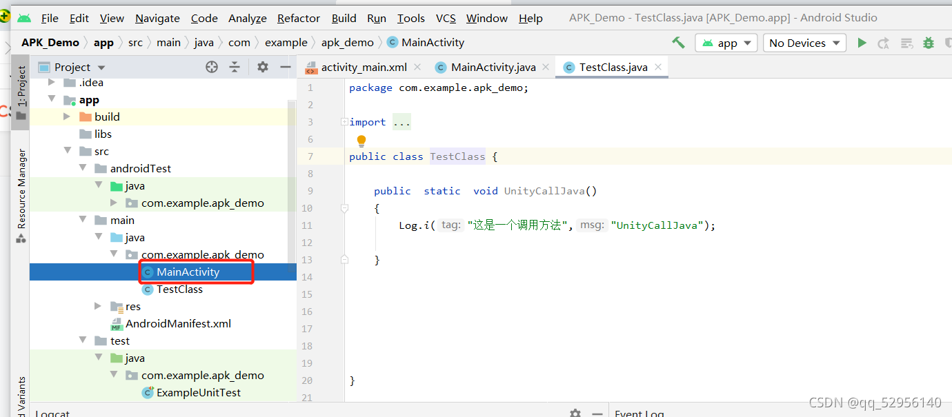 直接将他继承UnityPlayer即可,前提是已经导入classes.jar文件到安卓里,否则是找不到这个类的,完了,这里写了一个测试的方法
