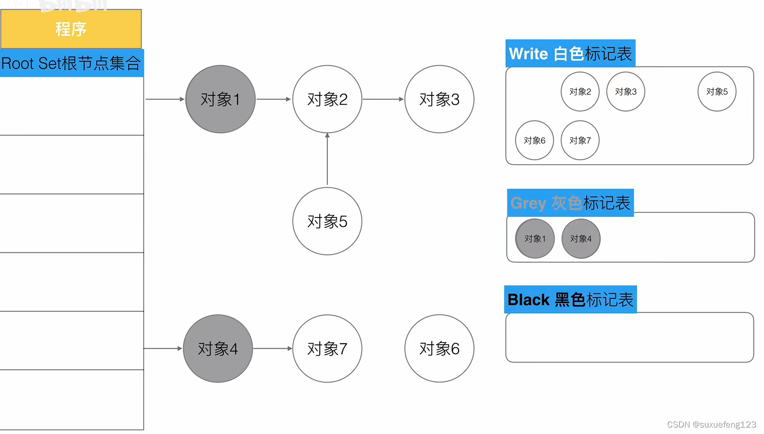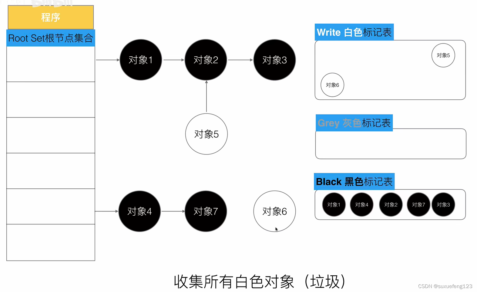 1.程序启初创建,全部标记为白色,将所有对象放入白色集合中
