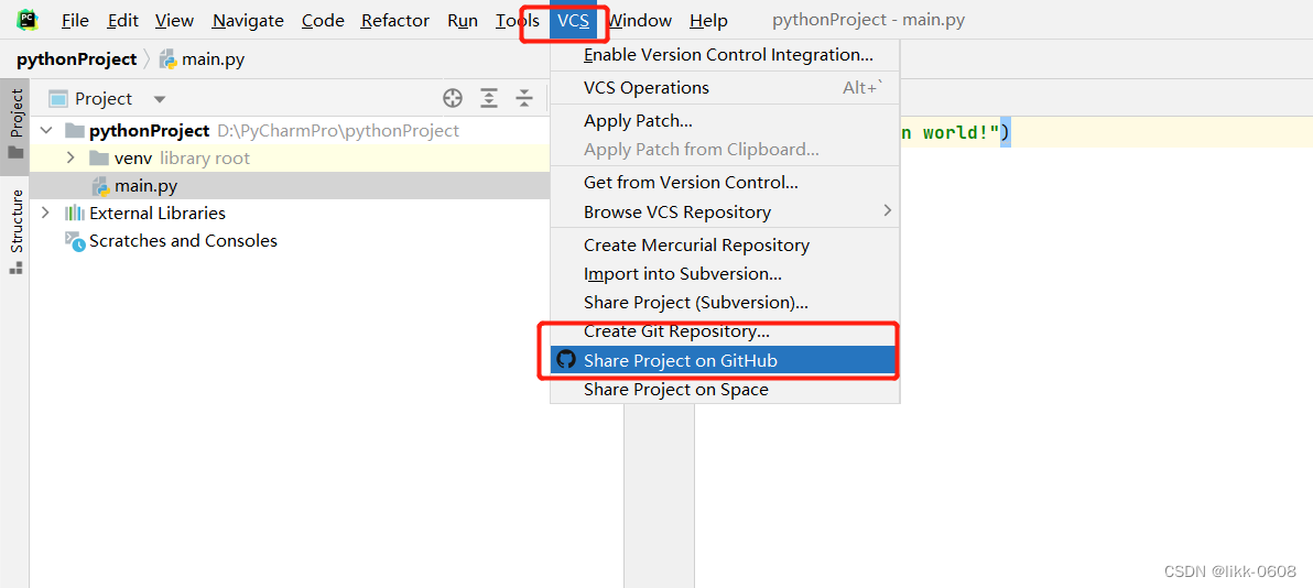 1、点击PyCharm的VCS->Share Project on GitHub,按照操作提示完成。