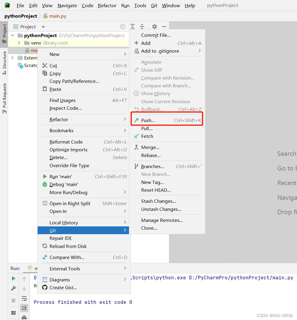 提交到GitHub库操作:选择工具栏 Git -> Push,完成GitHub库的提交。