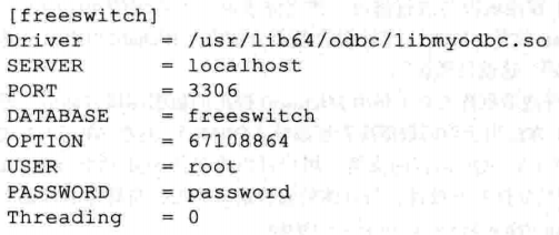其中,dsn为ODBC的 Data Source Name,即数据源的名称,在这里,我们使用了上面配置的名称 freeswitch; username和 password分别为连接数据库的用户名和密码。当然,如果把用户名和密码配置到odbc.ini中,则可以直接这样写: