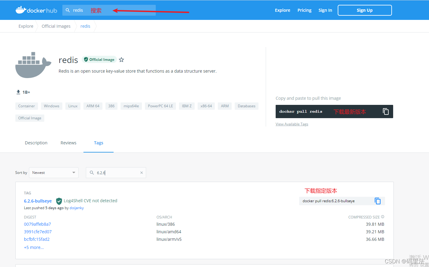 可直接默认下载最新镜像,也可以指定版本下载【注意,版本差异不大的软件可以直接下载最新版本,差异大的,例如java,mysql等,最好指定熟悉的版本进行下载】