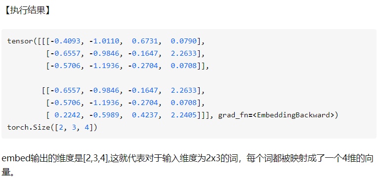 输出:输出 shape =(*,H),其中 * 为输入的 shape,H = embedding_dim(若输入 shape 为 N*M,则输出 shape 为 N*M*H);