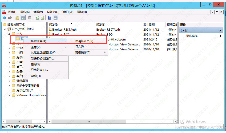 4、选择“个人”→“证书”→“所有任务”→“申请新证书”
