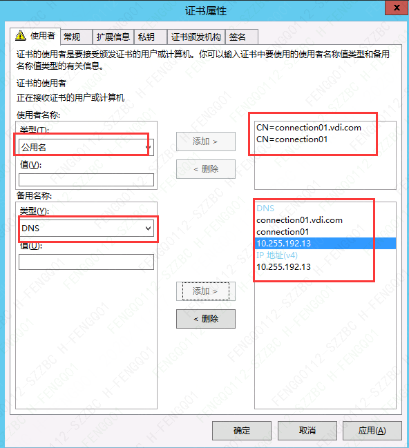 8、”使用者“ →”类型“选择”公用名“,备用名称可添加”DNS“,”IP地址“