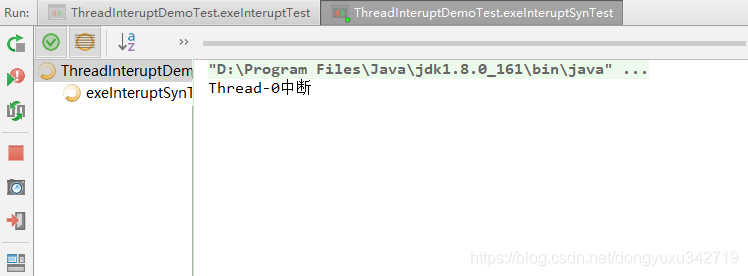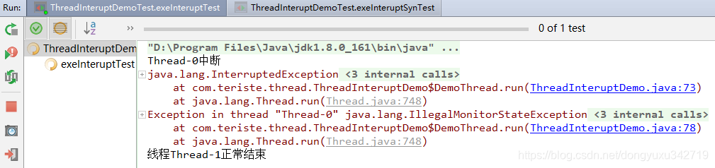 当执行exeInteruptSynTest()方法时,可以看到t0线程并没有响应中断,两个线程仍然处于相互等待锁释放的状态。