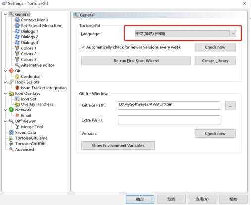 语言包安装完毕后可以在TortoiseGit的设置中调整语言