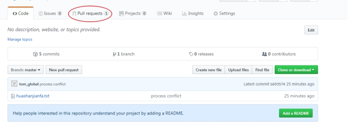 然后处理冲突,和分支合并处理冲突一样,注意commit时不要带文件名,commit后push到远程
