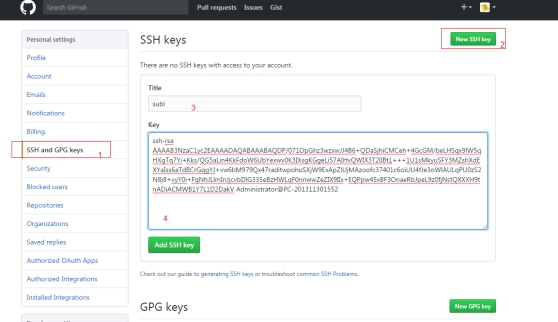 在key部分将id_rsa.pub文件内容添加进去,然后点击“Add SSH key”按钮完成配置。