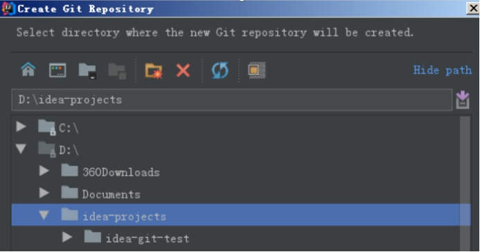 选择工程所在的上级目录。本例中应该选择idea-projects目录,然后点击“OK”按钮,在工程的上级目录创建本地仓库,那么idea-projects目录就是本地仓库的工作目录,此目录中的工程就可以添加到本地仓库中。也就是可以把idea-git-test工程添加到本地仓库中。