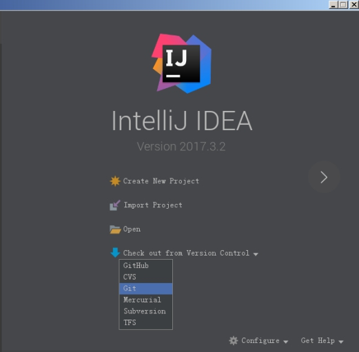 关闭工程后,在idea的欢迎页上有“Check out from version control”下拉框,选择git