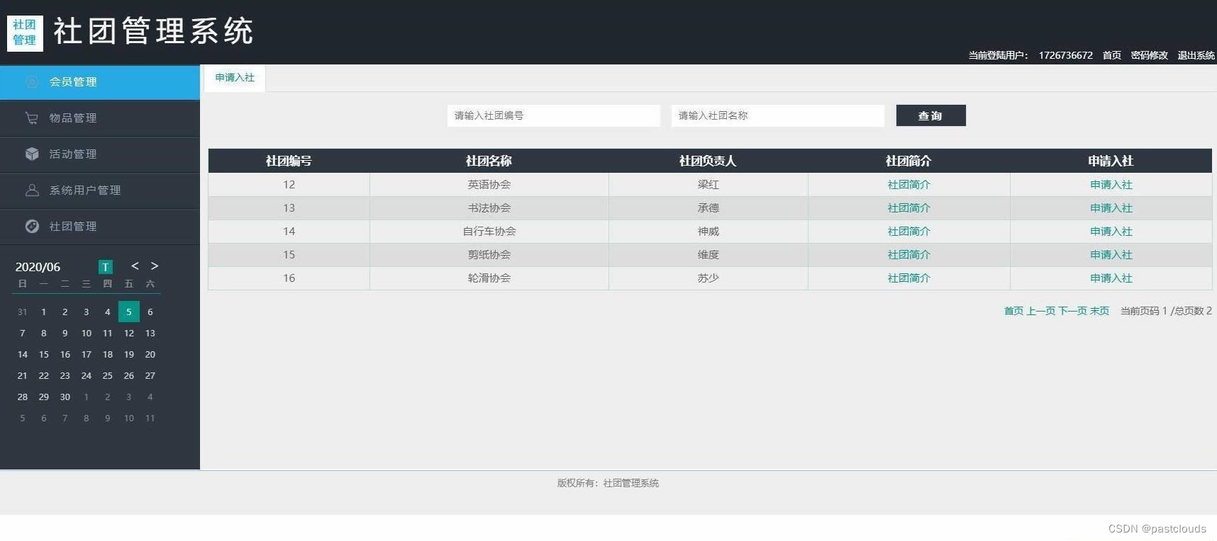 社员登录,申请入社,物品查看,活动申请等功能。