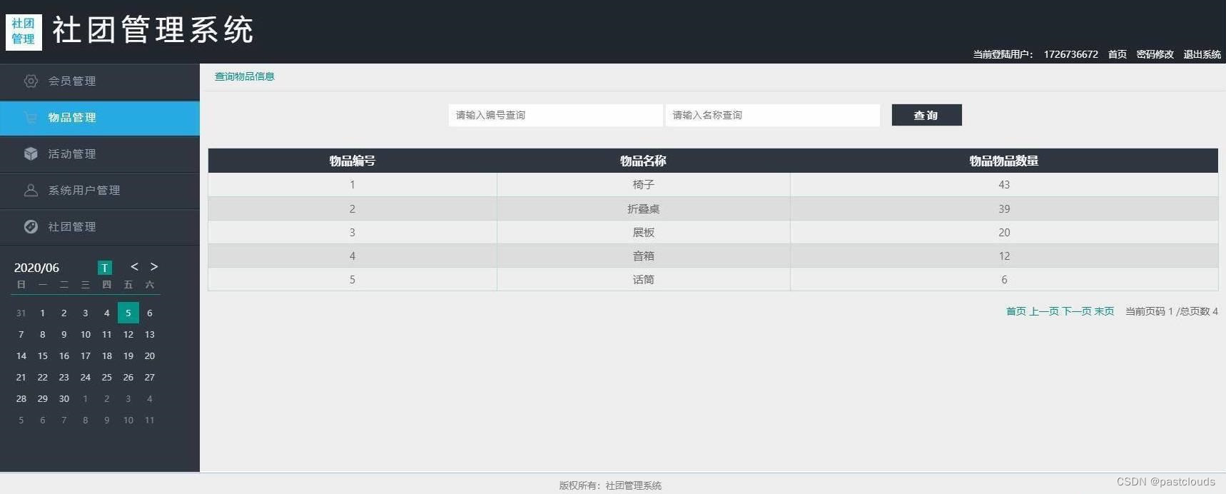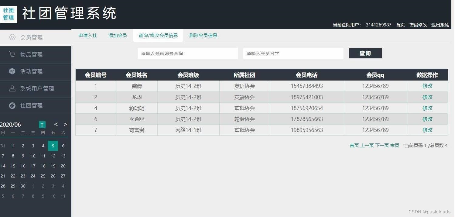 社团管理员登录,会员管理,物品管理,活动管理,查询社团信息,密码修改等功能。