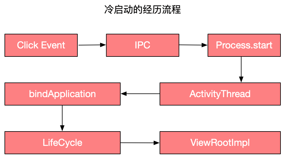 冷启动:特点是耗时最多,同时它也是衡量标准,我们在线上做的各种优化都是以它作为标准,从下面这张图片可以看出冷启动它经历了一系列的流程,所以它的耗时也是最多的。