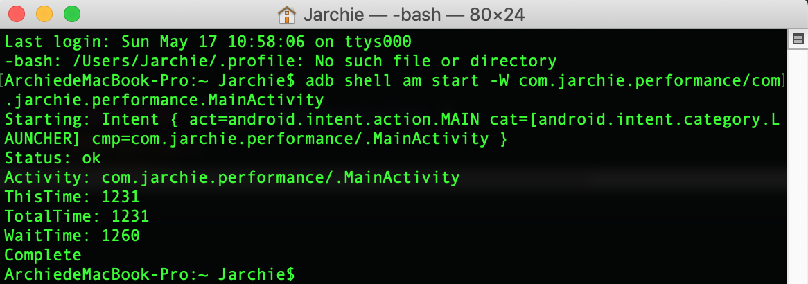 这种方式是我们通过在终端输入一条adb命令,然后它会打开我们要测试的app,同时进行结果的输出。具体的命令如下: