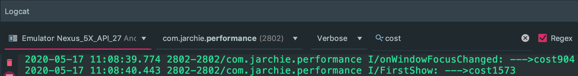 Log.i(msg, "--->cost" + cost);
