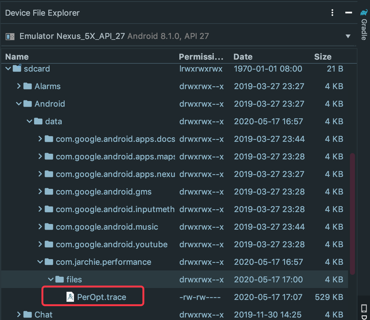 将我们的项目运行之后(注意开启运行时权限,这部分不是本节重点,我直接到应用里将权限开启了)生成文件如下: