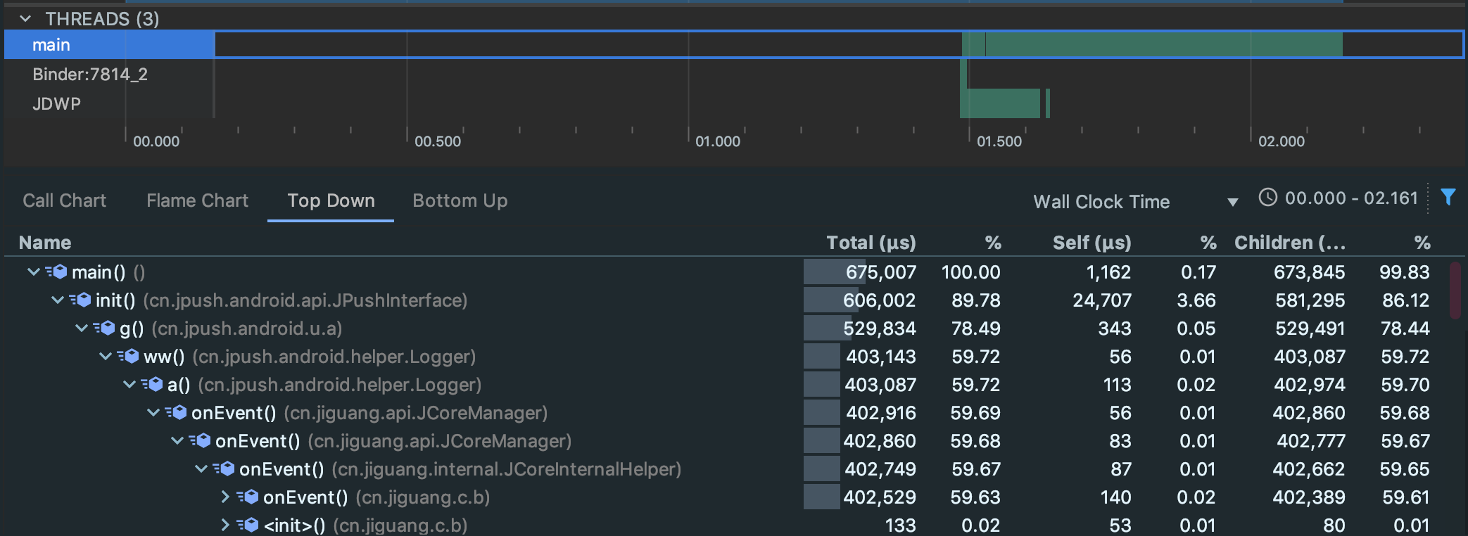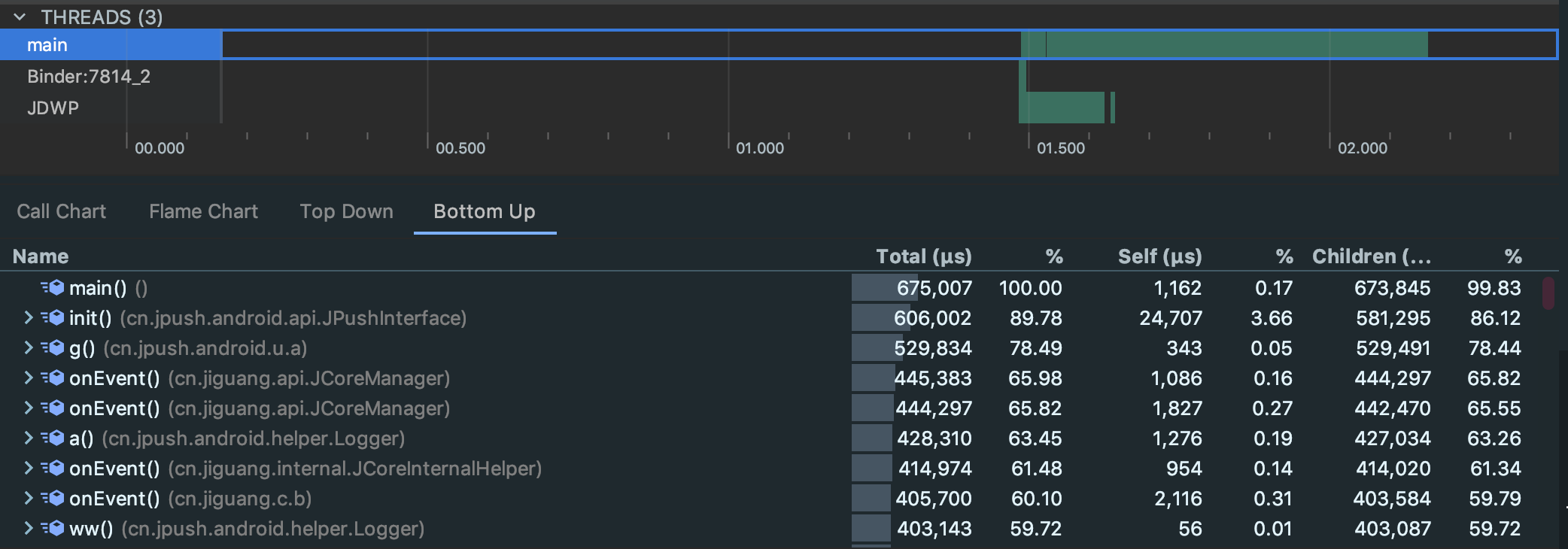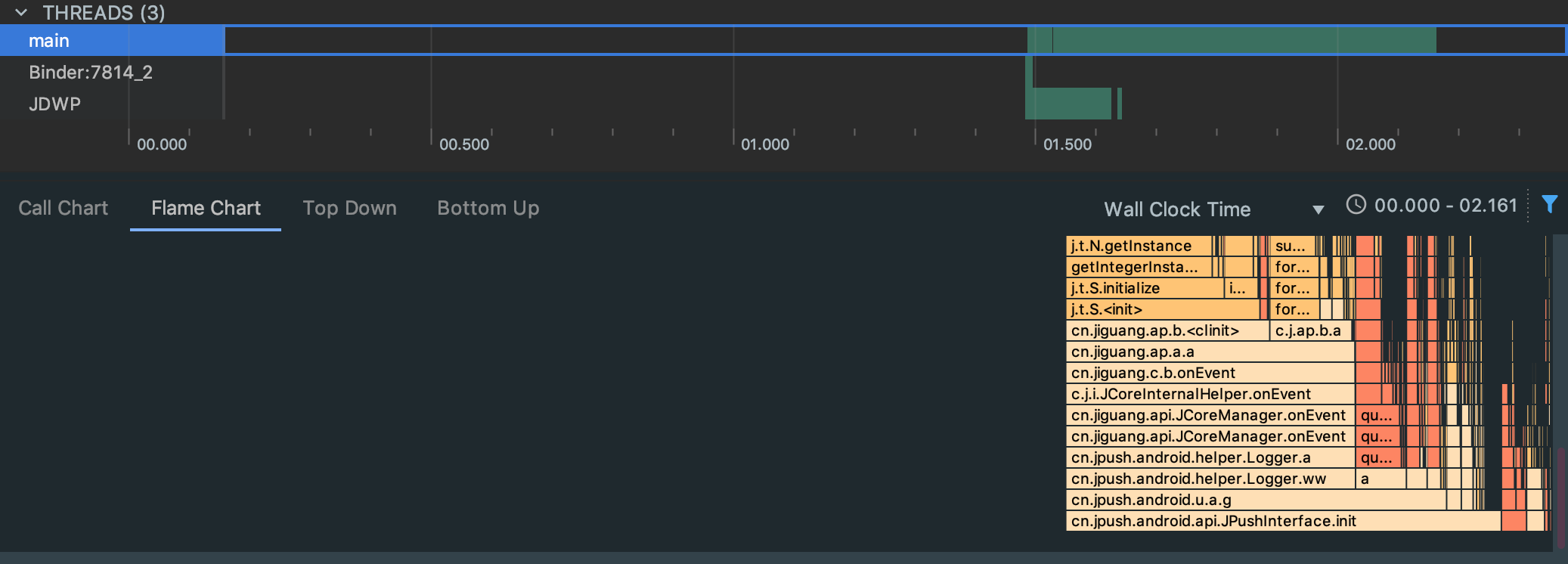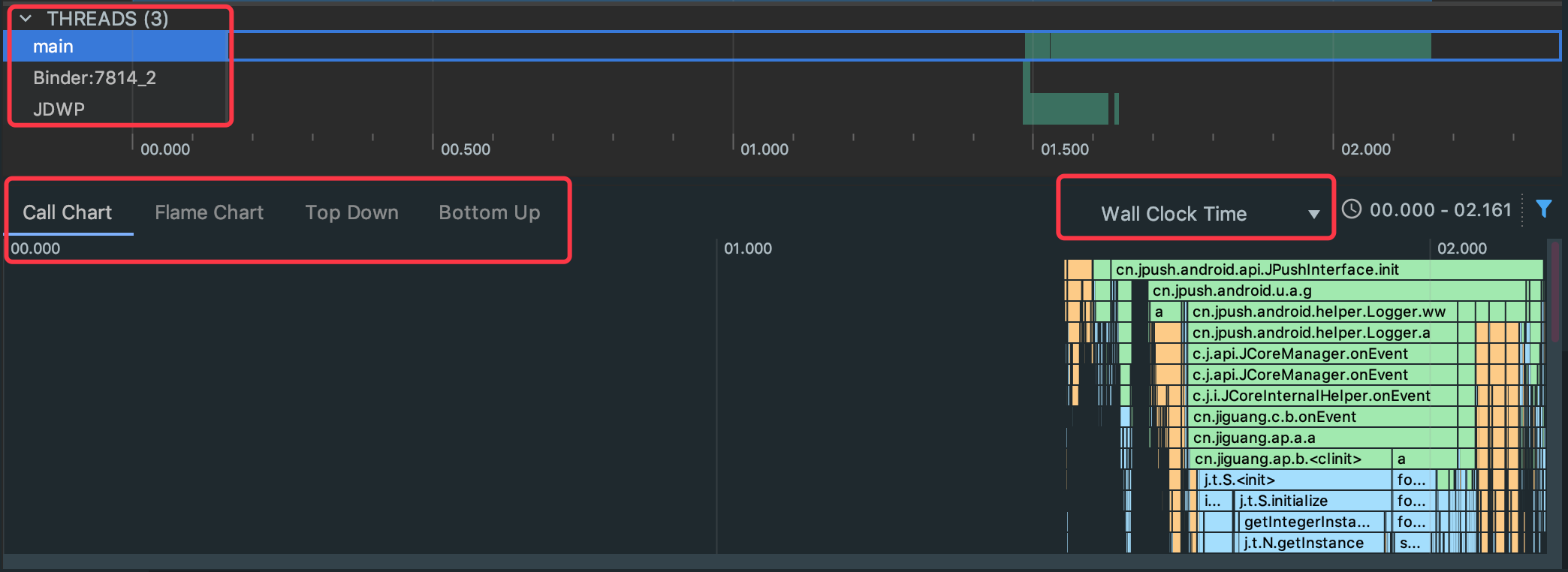 将生成的文件打开,如下图所示,可以看到Threads中是这个应用所有的线程数,我们可以看到线程总数以及对应的每个线程在具体的时间都做了哪些操作,然后下面有四个Tab可以切换,首先来看Call Chart,可以看到在具体的每一行都指向了具体的函数调用,将鼠标移到对应的每一行上面都有具体的执行时间等信息,沿着垂直方向看是具体的调用者,比如a调用b,则a在上方b在下方,而且不同的api它的颜色也是不一样的,对于系统api是橙色的,对于应用自身的函数调用颜色是绿色的,对于第三方api调用颜色是蓝色的(包括java语言的api)。