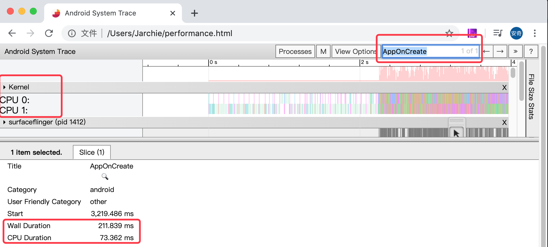 由上图中左侧可以看到有CPU的核心数,往下滑动还可以看到各个线程名称,然后还可以根据代码中打的Tag来搜索,下方会展示比较详细的trace信息(上图中也举例说明了,需要注意的Wall Time和CPU Time红色部分圈出),点到右侧图中具体的位置都会展示出比较详细的方法名称执行时间等信息。