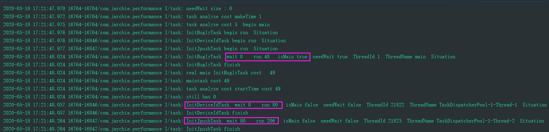 LaunchTime.endRecord("AppOnCreate");OK,通过上面这几行代码启动器就搞定了,可见它相比较于传统的异步方式还是好处多多啊,最后来看下运行结果吧: