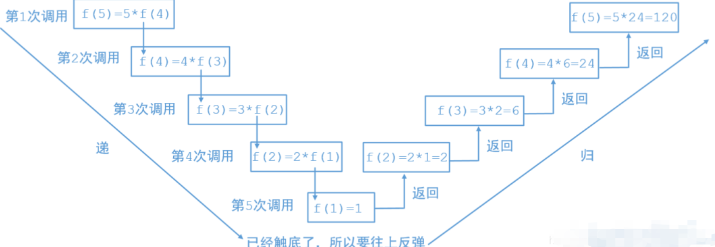 }我们求f(5)的时候,只需要求出f(4)即可,如果求f(4)我们要求出f(3)……,一层一层的调用,当n=1的时候,我们直接返回1,然后再一层一层的返回,直到返回f(5)为止。如图所示: