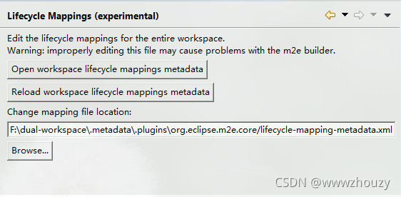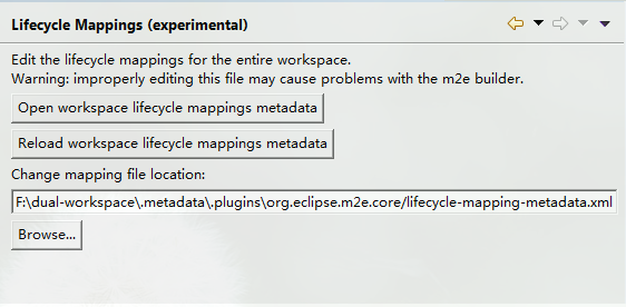 查看Change mapping file location一栏的地址,一般都是xxxxx/.metadata/.plugins/org.eclipse.m2e.core/lifecycle-mapping-metadata.xml,然而一般org.eclipse.m2e.core目录下没有lifecycle-mapping-metadata.xml文件